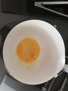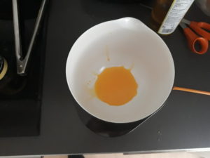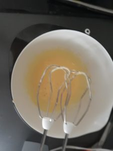 Mens der piskes, kom olien i langsomt, i små dråber, hold øje med at olien bliver optaget i ægget og at massen bliver tykkere og tykkere