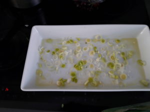 Læg skiverne porrer i fadet.