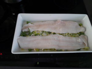 Læg fisken på porrer skiverne i fadet.